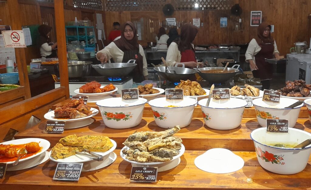 Tempat makan ini hadirkan suasana tradisional dengan konsep prasmanan. Kami datang ke sini pada malam hari berbarengan dengan turunnya hujan. Jadi, bisa dibilang mestakung, lah, alias semesta mendukung. Saat perut lapar dan cuaca hujan, biasanya makan terasa lebih paripurna.