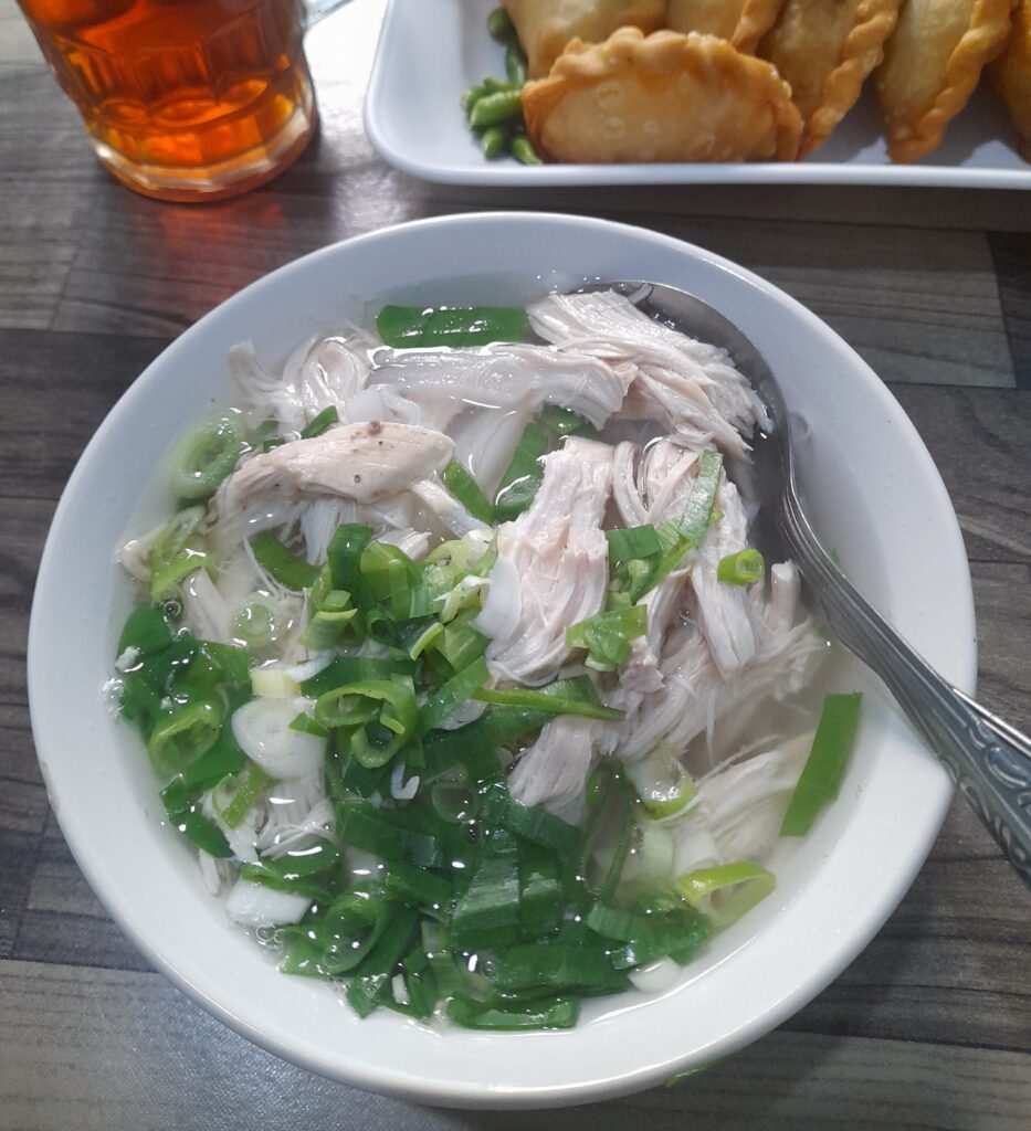 Rasanya gurih. Kuahnya segar. Tekstur sahounnya kenyal. Tampilan sahoun ayam jadi lebih menawan karena ditabur potongan bawang daun. Di sini tersedia juga aneka macam gorengan dan kerupuk. Kalau kamu gak terbiasa sarapan dengan makanan berat, sebaiknya cukup memesan setengah porsi saja.